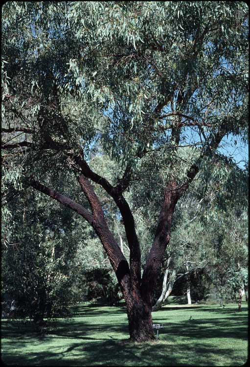 • Tree to 35m high with red-brown to brown-black "ironbark" and dull green or grey-green adult leaves.