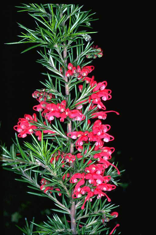 Evergreen dense medium shrub. Very vigorous growth. Masses of bright-red spider flowers during winter and spring. Well-drained soil, full sun. Frost resistant.
